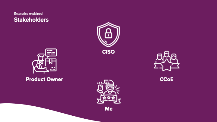 Because you often work in sprints there are stakeholders in place: the developer, a product owner who decides on what gets prioritized, the Cloud Center of Excellence who are responsible for the landing zone and set the boundaries for developers, and the CISO - the team you want to keep happy all the time.