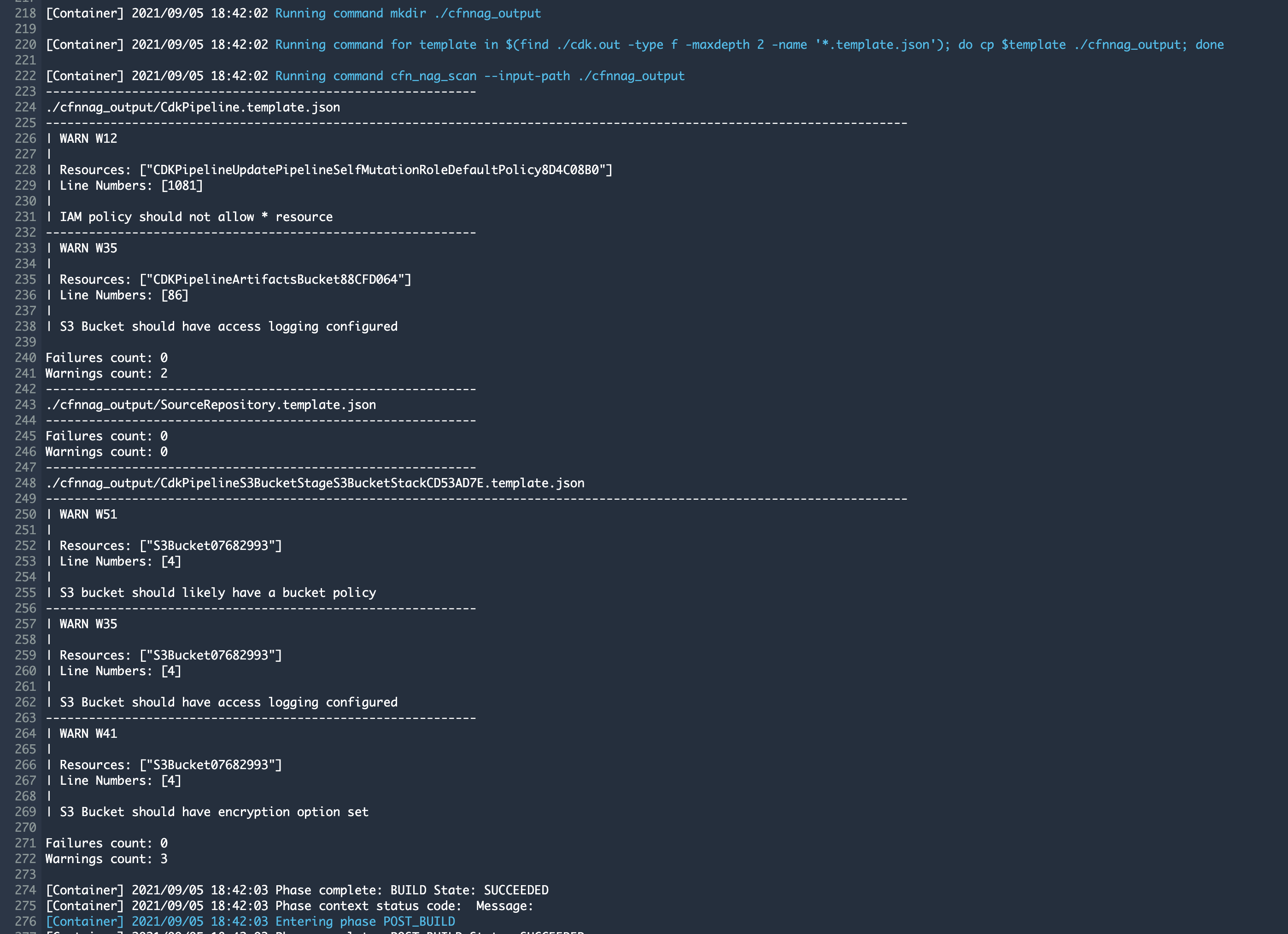 During the run, the CodeBuild phase which is responsible for the generation of the CloudFormation template, our CFN_NAG for loop is executed as well. So all the templates are validated with CFN_NAG.